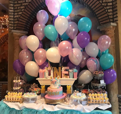 Unicorn Candy Table with all pink, purple and teal decor and candy