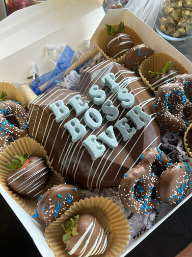 An 8 inch by 8 inch Chocolate Heart. Filled with Gummy Candy and surrounded by 3 Chocolate Pretzels, 3 Chocolate Oreos and 6 Strawberries. Comes with a mallet for smashing. In the special instructions please indicate your preferred sprinkle and drizzle colors. Up to16 letters can be fit onto the heart itself. Message us for custom colors