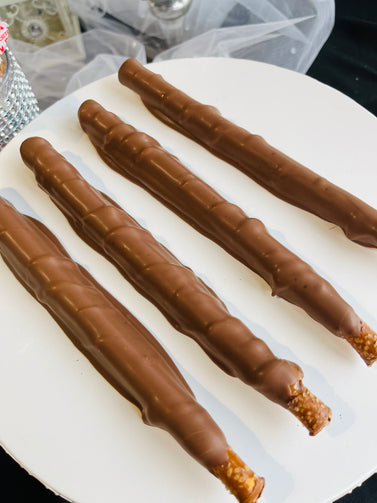 Pretzel Rods dipped in perfectly smooth caramel and then dipped in delicious Merckens melting chocolate. Individually wrapped with and enclosed with ribbon.