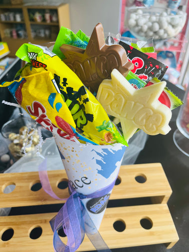 Contents include, Sports or Dance Chocolate Pops, Pop Rocks, Sour Patch Kids, Sour Belts and More