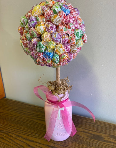 A Lollipop Ball placed on top of a Pink Mason Jar. Perfect for any Candy Party.