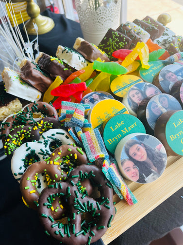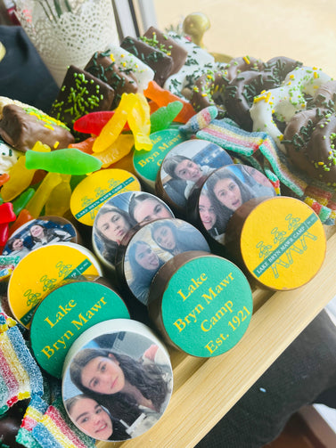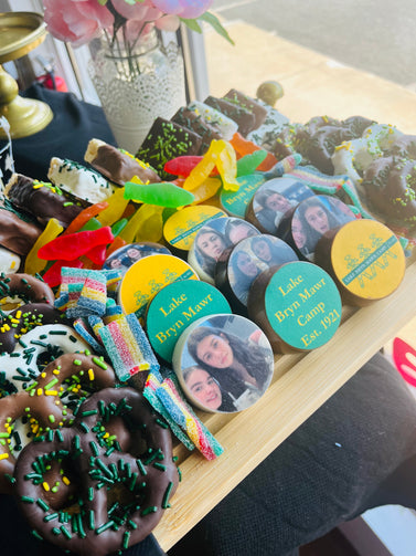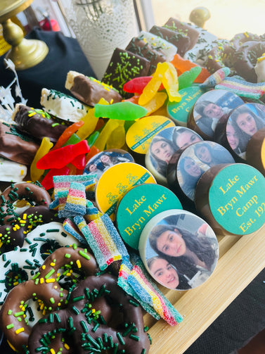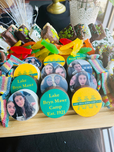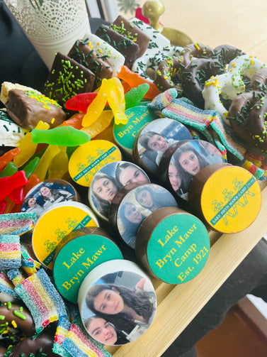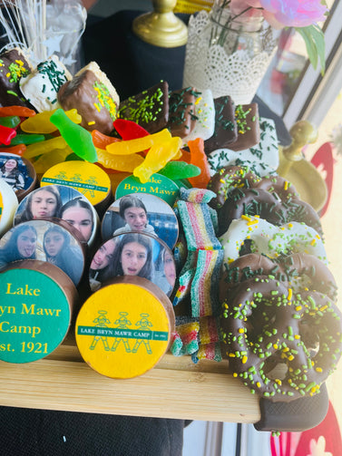 Make every day a party with our custom camp charcuterie boards! Perfect for visiting day, welcome homes, or bon voyages. Comes with 12 oreos, 12 pretzels, 6 rice krispy treats and 6 graham crackers, as well as 1/2 a pound of gummy candy in your camp colors. Add your own camp logos or pictures for a personalized touch. It's like bringing the camp experience home (literally)! Provide camp name at check out. You can also email us pictures for the oreos as well.