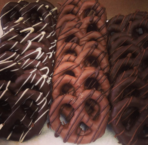 Hand Dipped Chocolate Covered Pretzels. Available in Milk, Dark and White Chocolate. Also available with tons of toppings