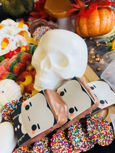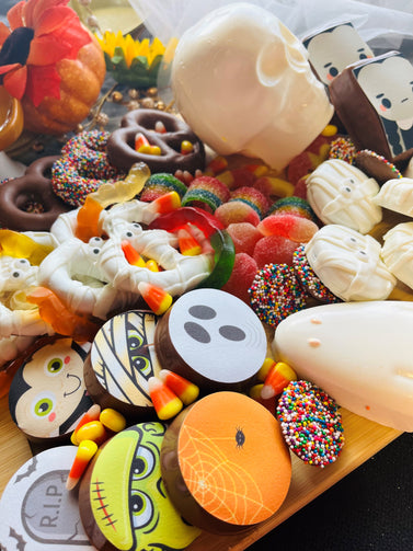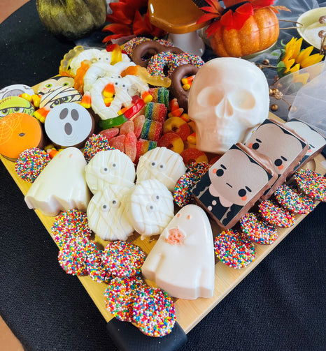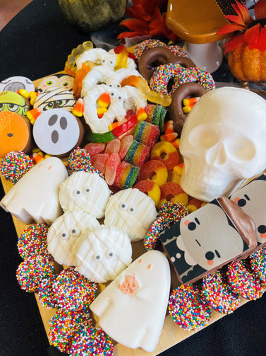 Satisfy your sweet tooth this Halloween with our spooky Candy Charcuterie Board! This charcuterie board will give you a real "treat", featuring a delicious selection of halloween-themed chocolate, candy, and more! Make your Halloween "ghoulish" and indulge in this yummy board!