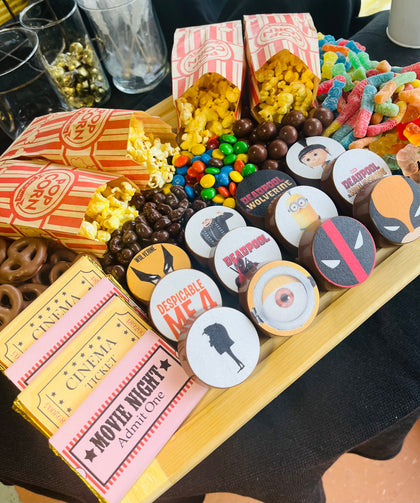Make your next movie night an event to remember, with our Movie Night Charcuterie Board! Featuring your favorite movie themed chocolate covered Oreos, chocolate tickets, gummy & chocolate theatre candy, popcorn, and chocolate covered mini pretzels, this board is sure to enhance your cinematic experience. Grab this board and get ready for a fun and tasty evening! (Lights, camera, snack-tion!)