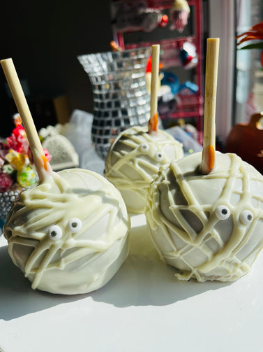 Caramel & White Chocolate Dipped Green Granny Smith Apples. Drizzled with white chocolate bandages and sugar eyes. Individually wrapped and ribboned